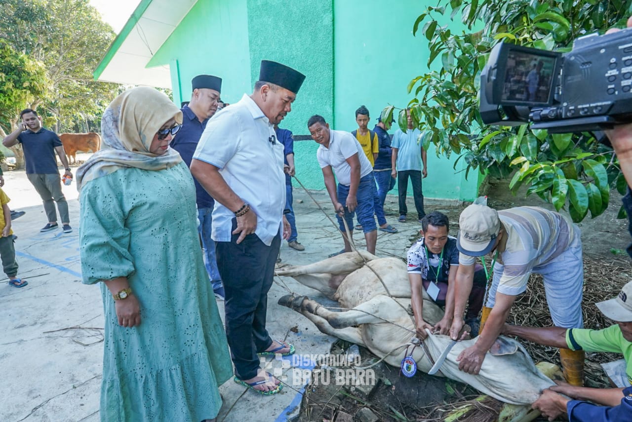KoranSumut.id – BATUBARA : Bupati Batu Bara, H. Baharuddin Siagian bersama Ketua TP PKK Batu Bara Ny. Henny Heridawaty Baharuddin dan Wakil Bupati, Syafrizal menyaksikan penyembelihan hewan Qurban.