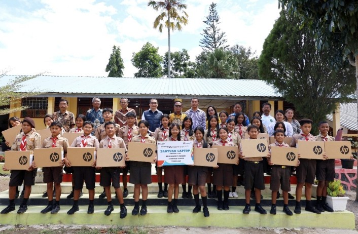 Dihadiri Vice President TJSL Inalum, Zainuddin Iqbal menyerahkan laptop guna mendukung proses belajar mengajar berbasis digital pada 11 Juli 2025 di Halaman Sekolah SMP 2 Harian, Kabupaten Samosir.