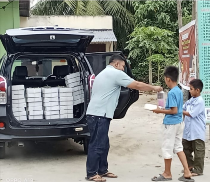 Keterangan : Direktur Utama PT. Maha Vanrika Jaya, Ery Suryadi Irsan berikan takjil dan nasi kotak kepada anak-anak yang berpuasa di Simpang Compil Desa Pulau Sejuk, kecamatan Datuk Lima Puluh, Batu Bara. Jum'at, (21/03/2025).