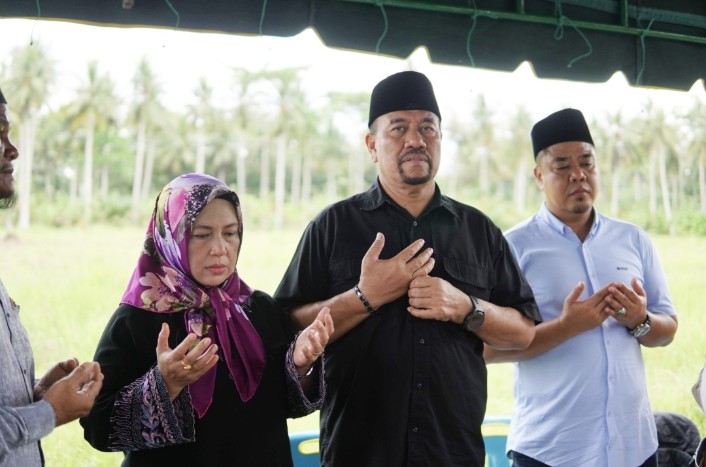 Keterangan : Paslon Bupati dan wakil Bupati Batu Bara Periode 2024-2029 saat mewakafkan sebidang tanah di Desa Dahari Indah, Kecamatan Talawi, Kabupaten Batubara. Rabu, (13/11/2024).