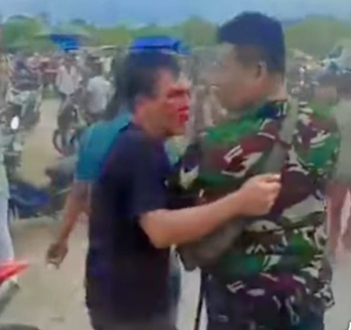 Dari video yang beredar terlihat, pria yang mengenakan pakaian hitam dengan wajah berlumur darah diamankan oleh personel TNI dari amukan masa.